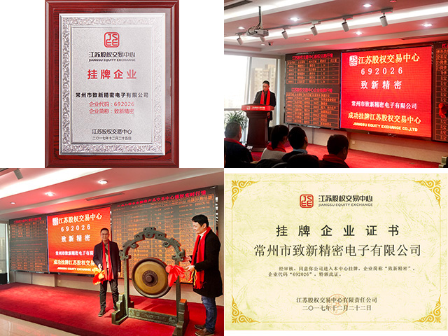 2018年1月11日下午,江蘇股權交易中心企業(yè)集中掛牌儀式隆重舉行。本次掛牌的共有38家企業(yè),其中常州市致新精密電子有限公司(以下簡稱“致新精密”)成功掛牌成長板。掛牌儀式的成功舉行,要感謝江蘇股權交易中心對我司各方面實力的審計與認可。